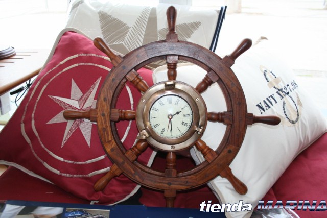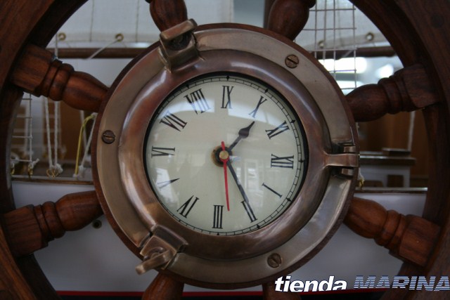 Clásica rueda de timón con un reloj con cuerpo de Laton Viejo dando una sobria elegancia del conjunto.