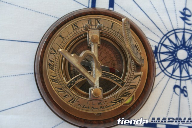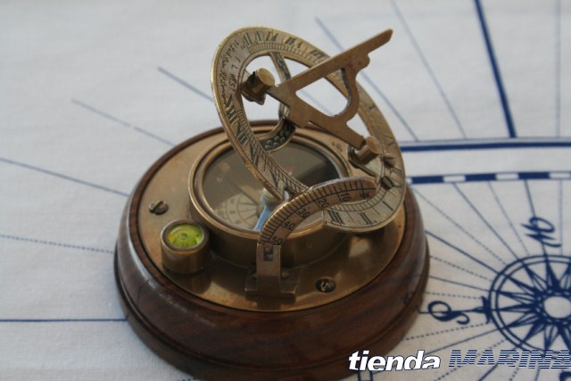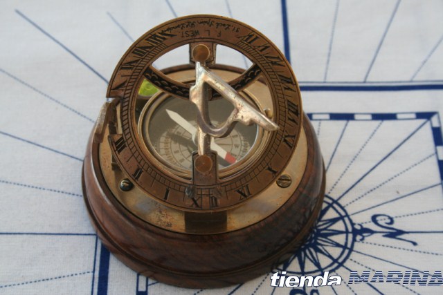 Reloj de sol y brújula todo en una pieza, la brújula tiene punzón para sujeción de la flecha, acollada sobre un taco redondo de madera maciza lijada manualmente y barnizada en satinado quedando perfecta para su decoracion