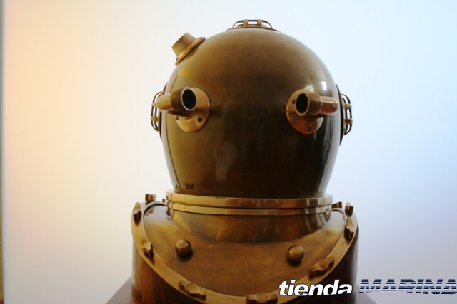El casco de la escafandra original permite al buzo permanecer debajo del agua,esta hermeticamente cerrada con un cristal frente a la cara y orificios y tubos para renovar el aire.